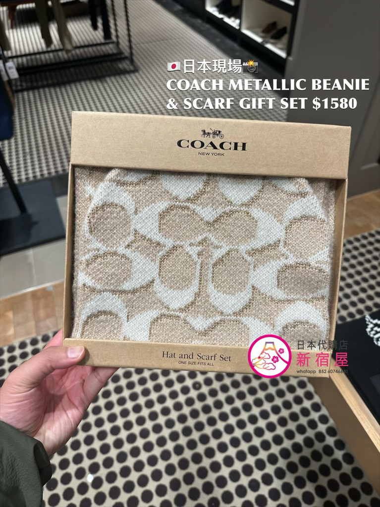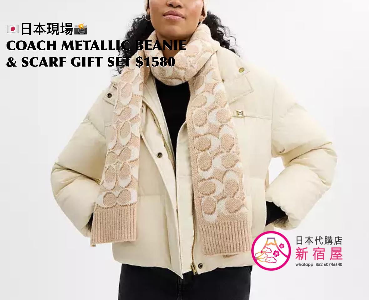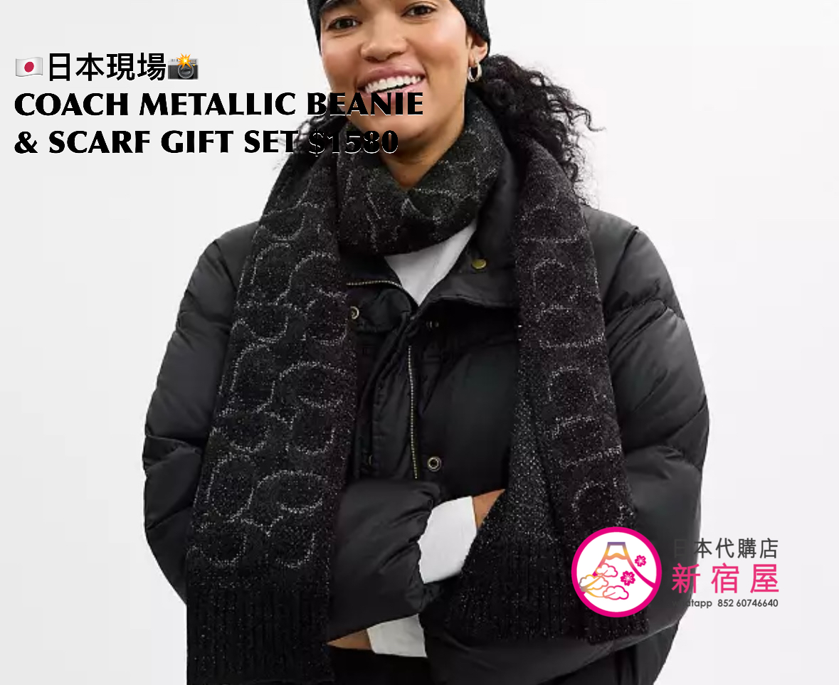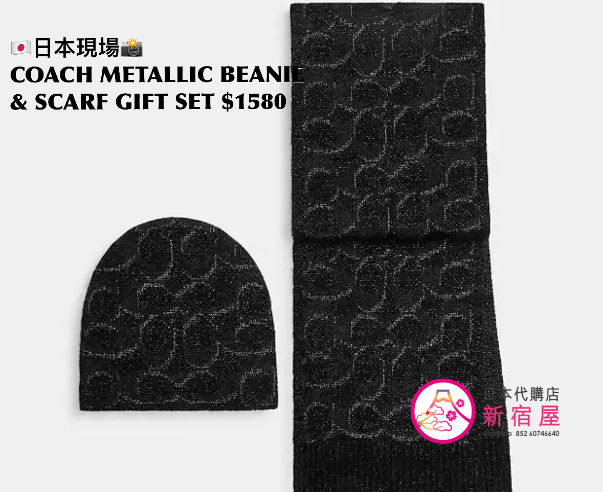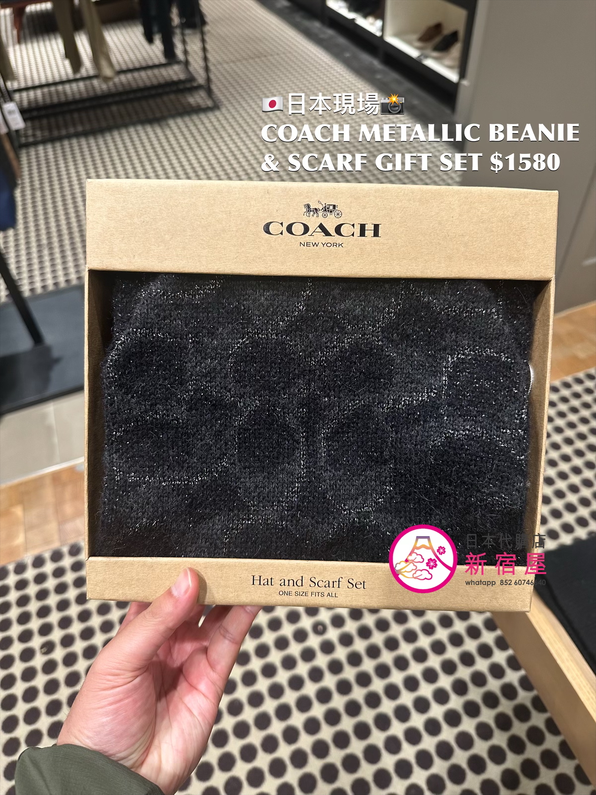 COACH METALLIC BEANIE & SCARF GIFT SET 193x23.5cm,BLACK/ IVORY,$1580