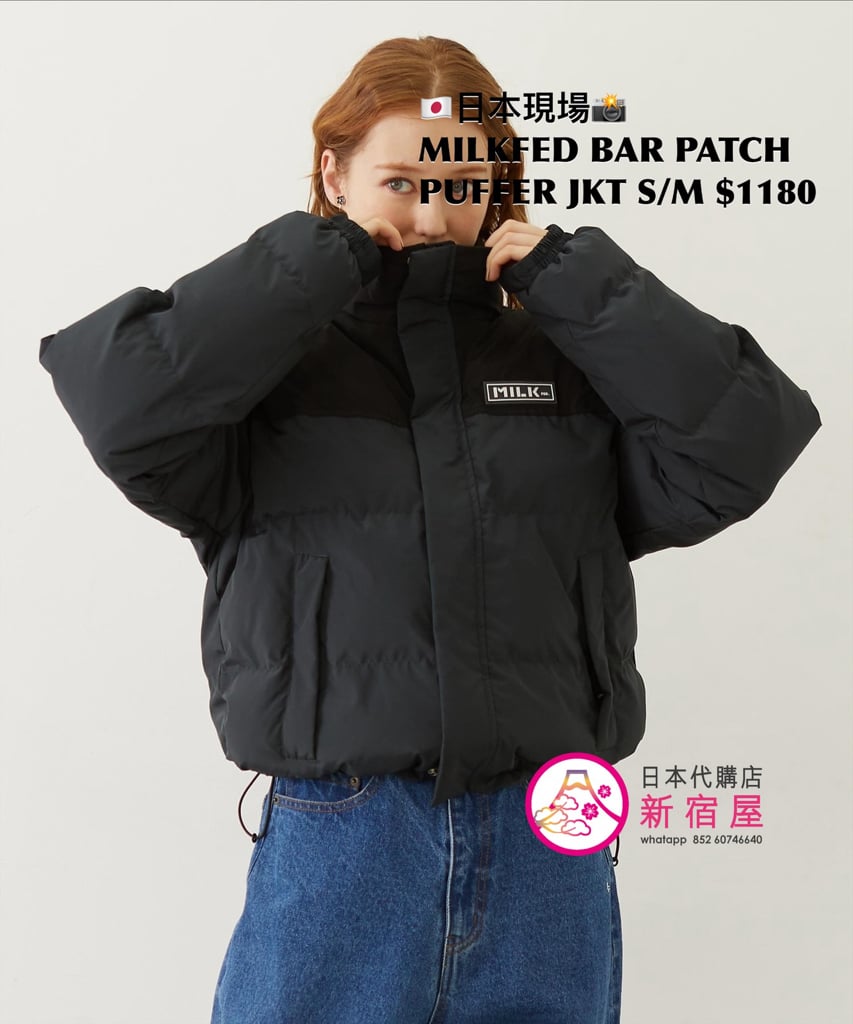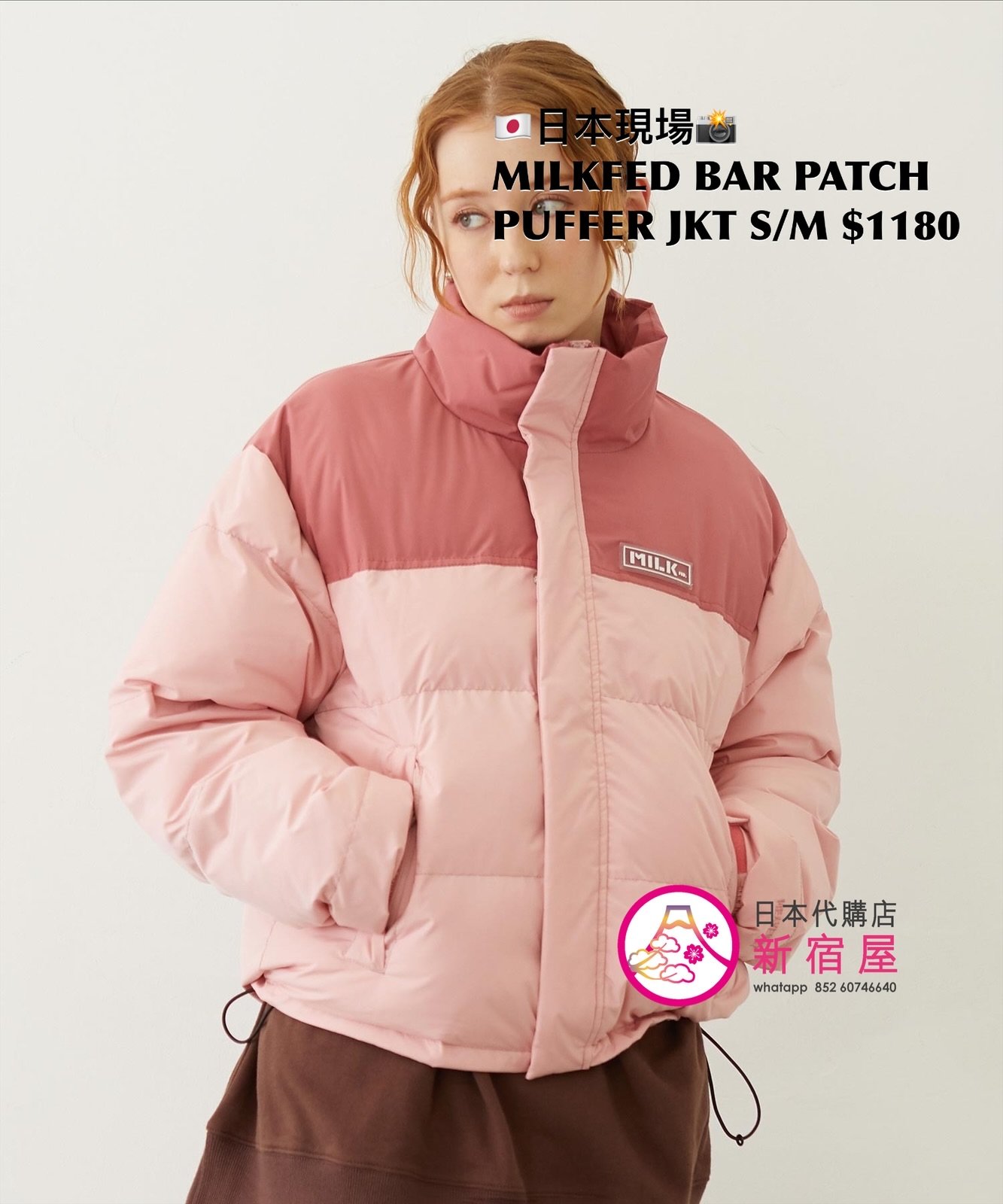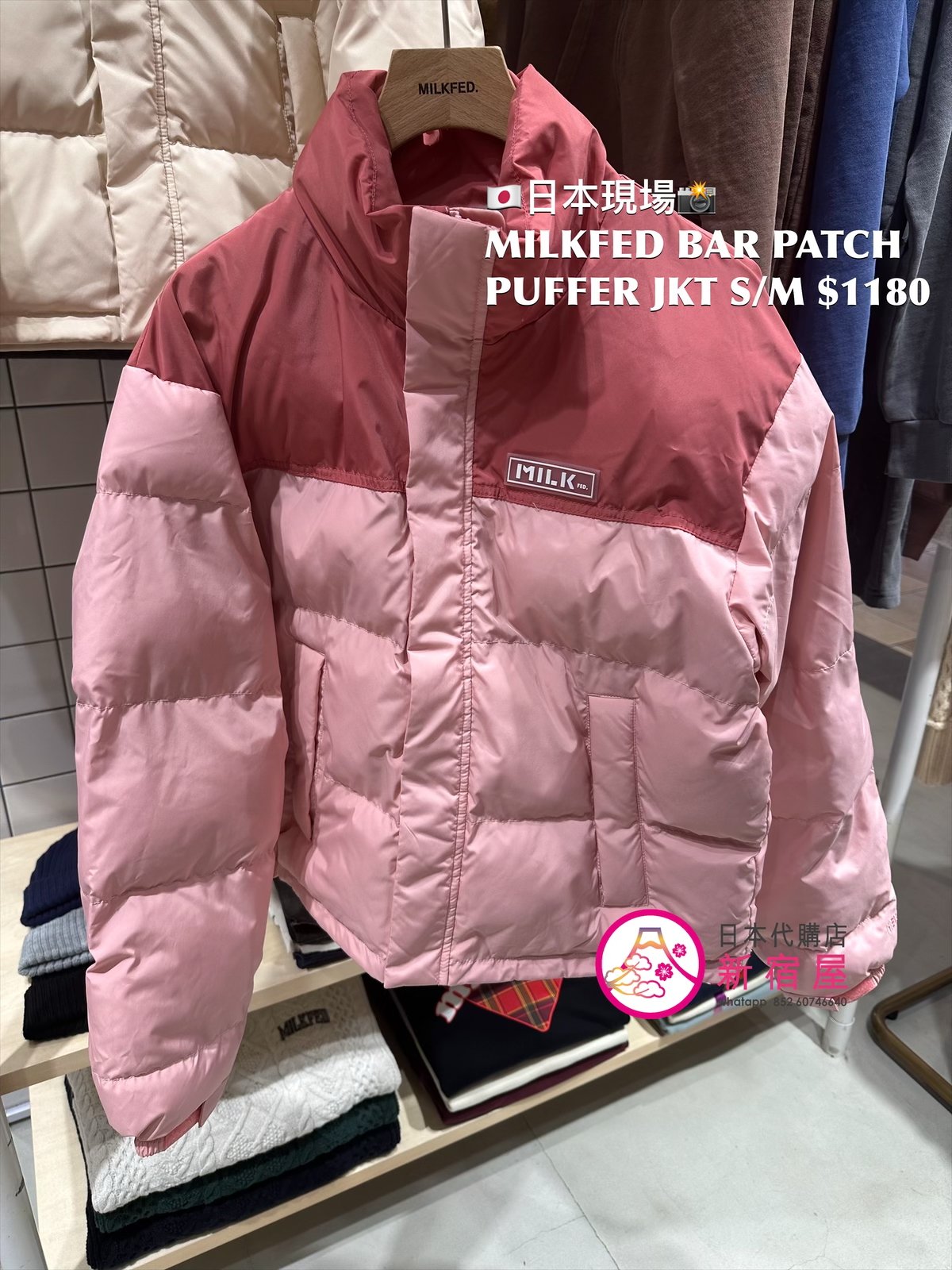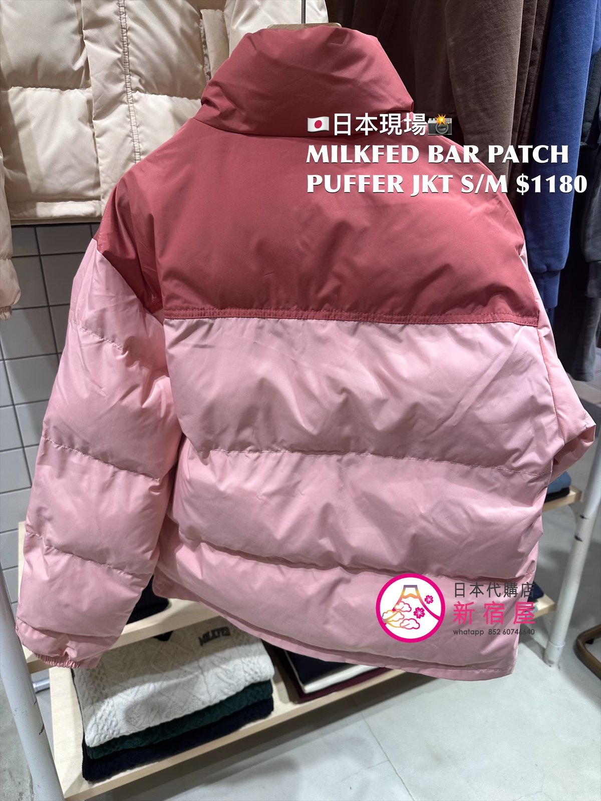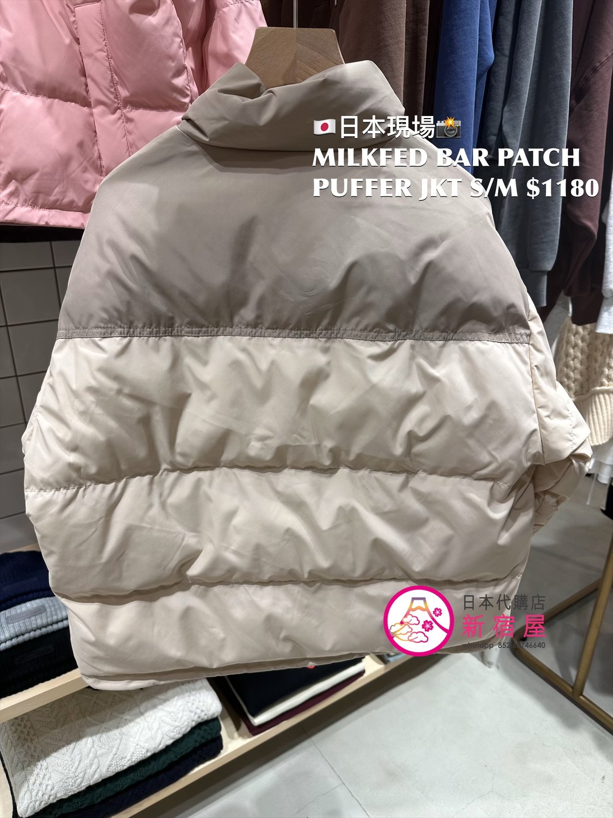 MILKFED BAR PATCH PUFFER JACKET SIZE S/M,OFF WHITE/ BLACK/ LIGHT PINK,$1180 🧥參考尺寸 SIZE S: 身幅 58.5 著丈 59cm SIZE M: 身幅 60.5 著丈 61cm