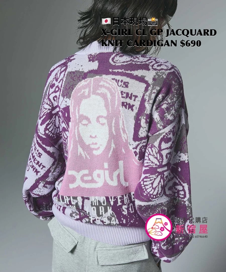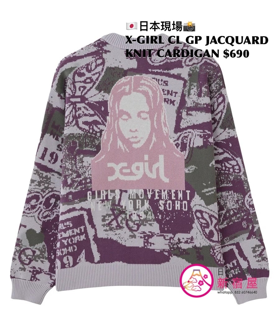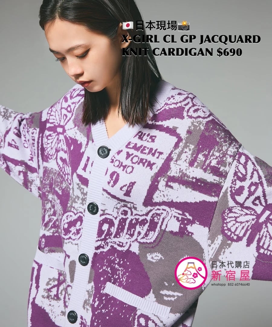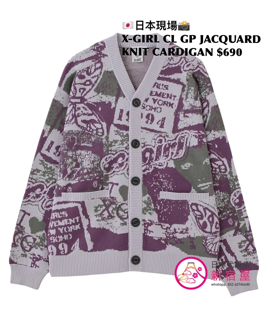 X-GIRL COLLAGE GRAPHIC JACQUARD KNIT CARDIGAN ONE SIZE,PURPLE/ OLIVE,$690 👚參考尺寸 ONE SIZE: 身幅 56 著丈 66cm