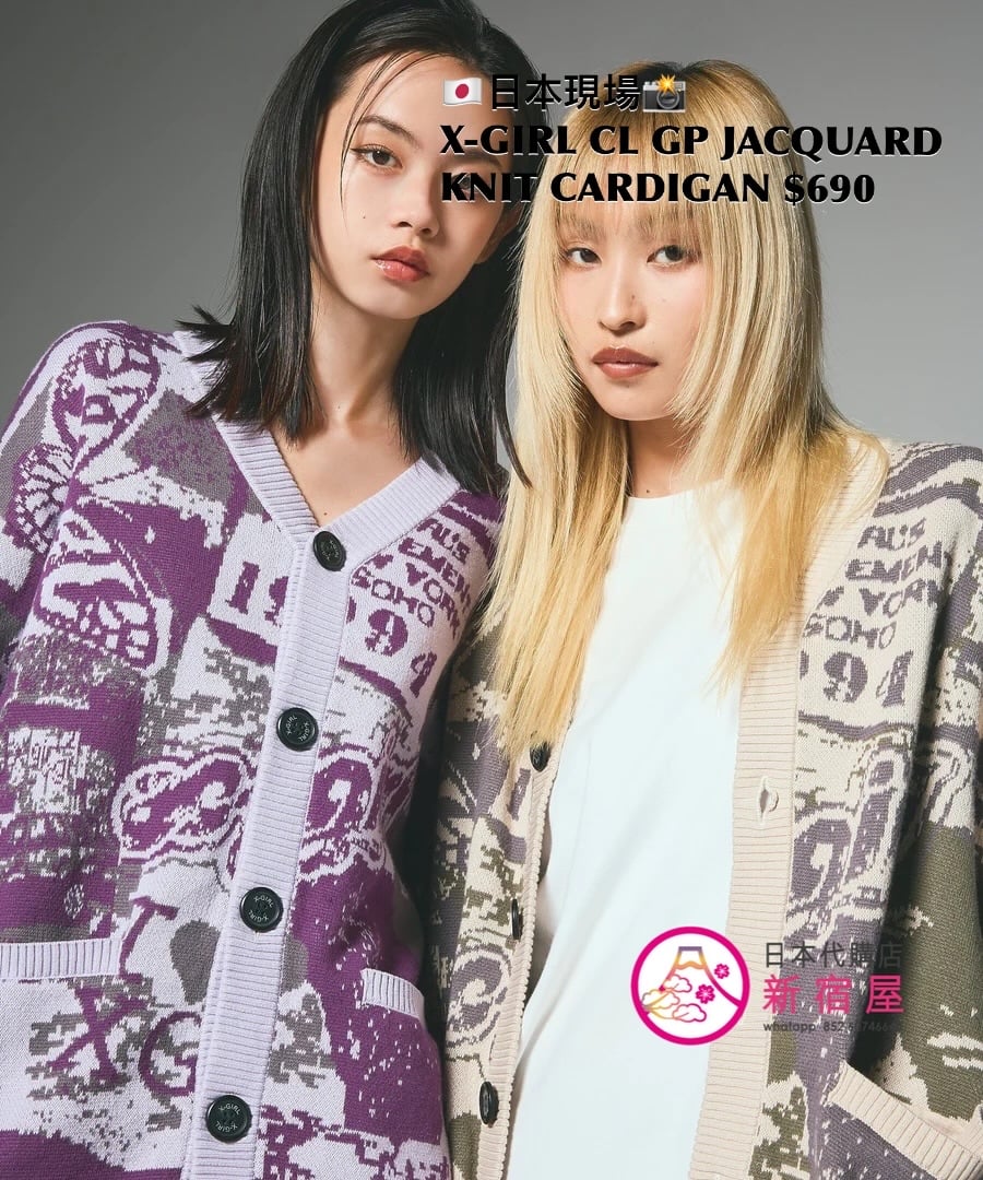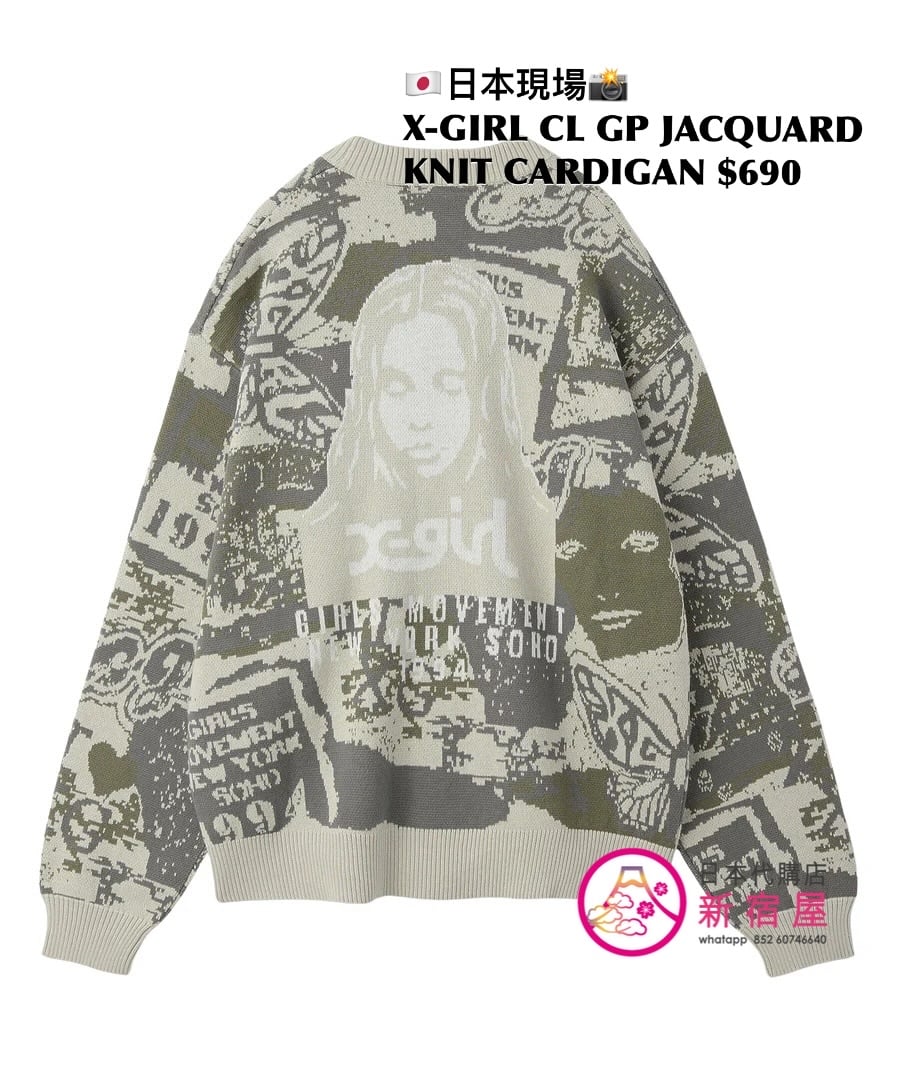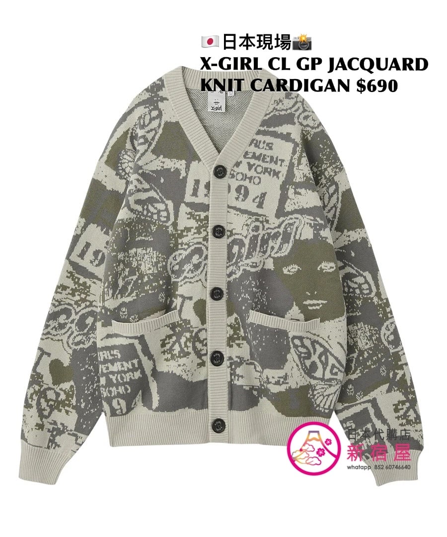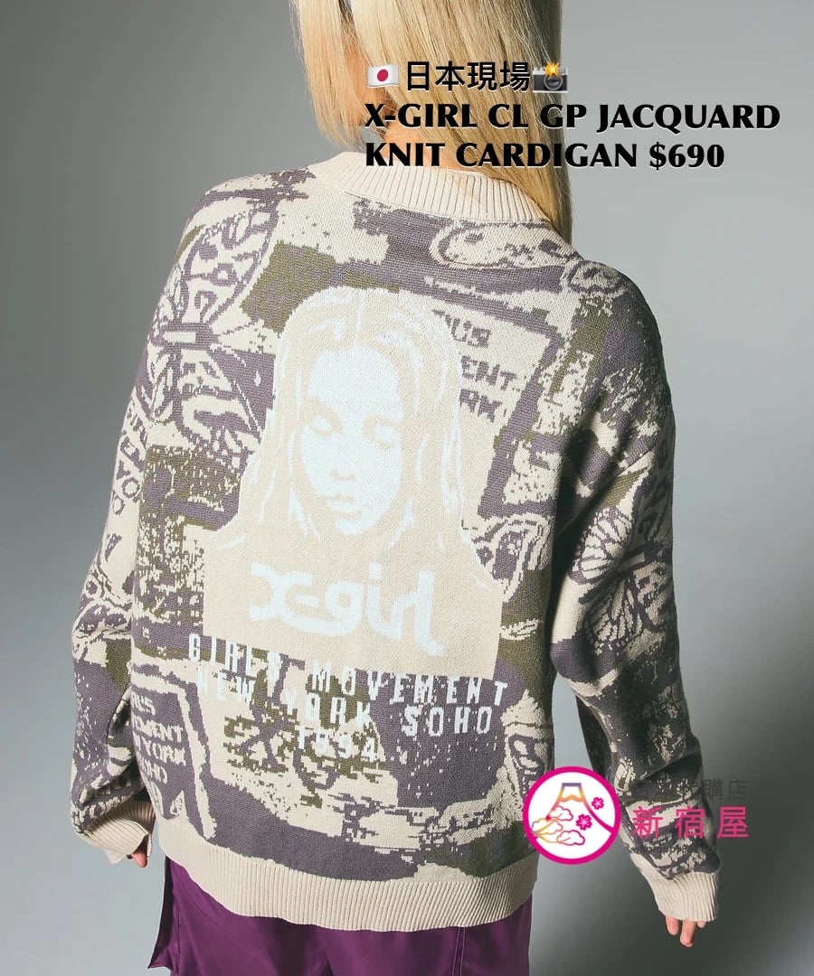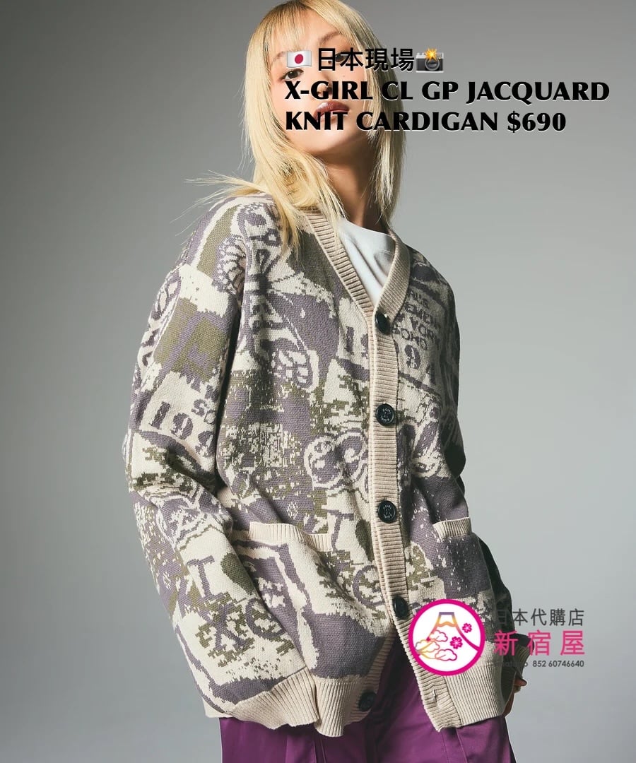 X-GIRL COLLAGE GRAPHIC JACQUARD KNIT CARDIGAN ONE SIZE,PURPLE/ OLIVE,$690 👚參考尺寸 ONE SIZE: 身幅 56 著丈 66cm